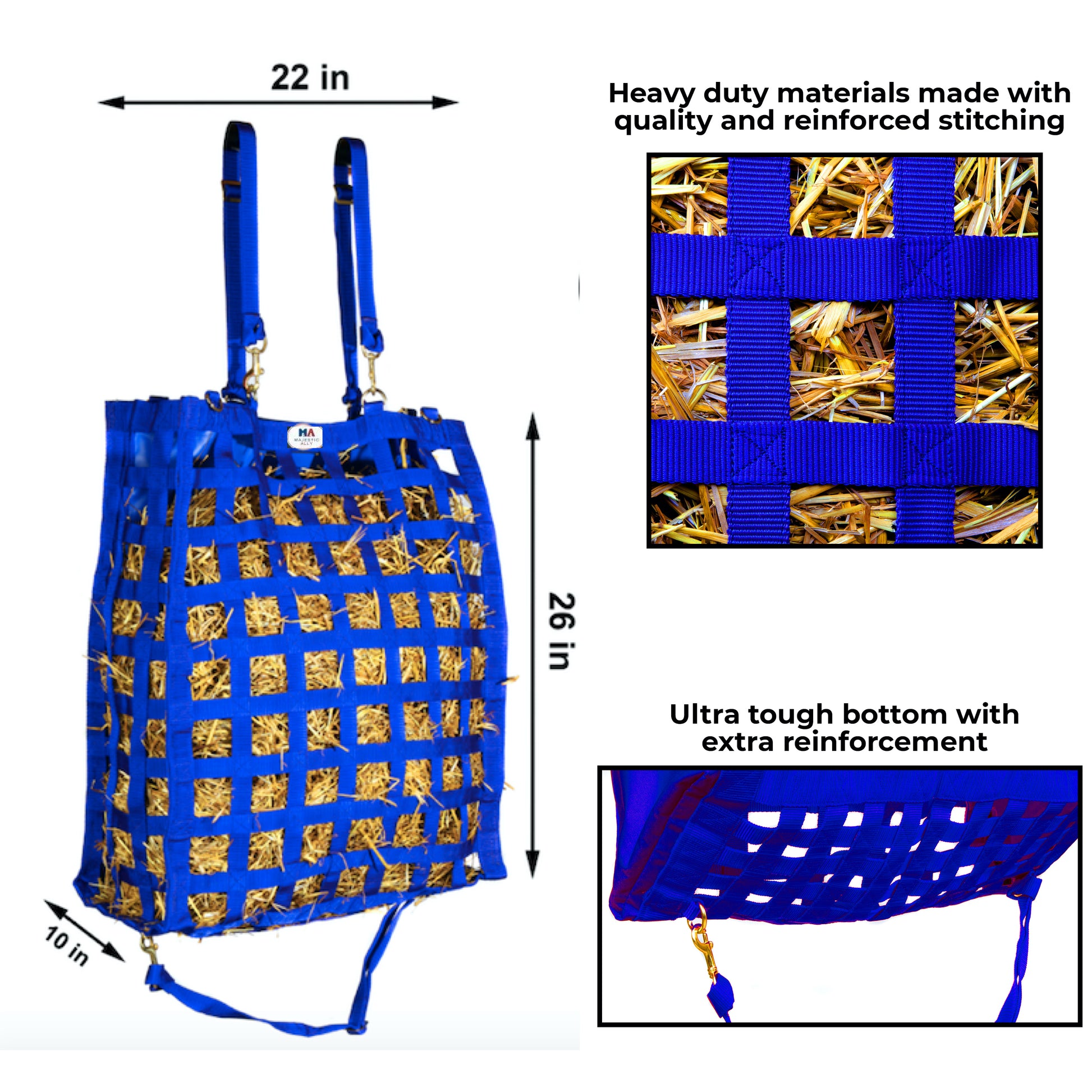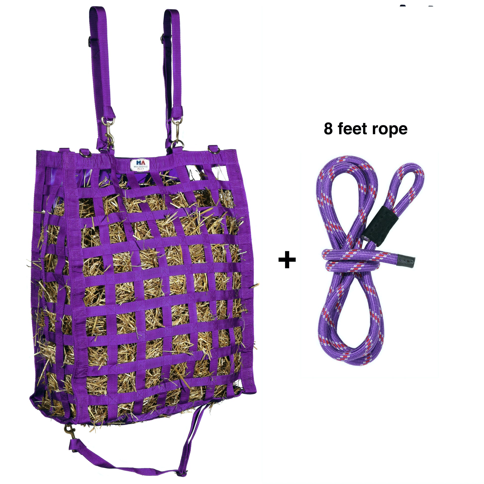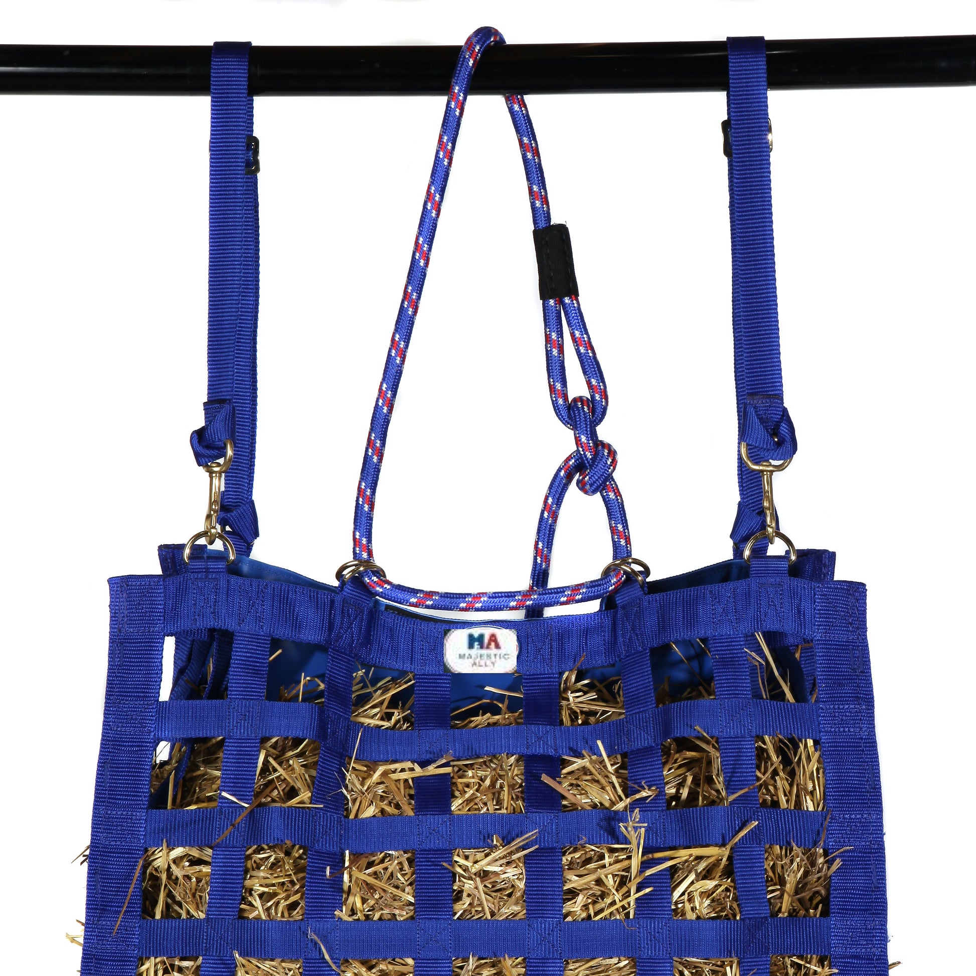 Majestic Ally Three-Side Open Slow Feeder Hay Bag with 2"x2" Holes and 8-Feet Poly Rope - Horse and Livestock Feed Bag with 1-Year Warranty