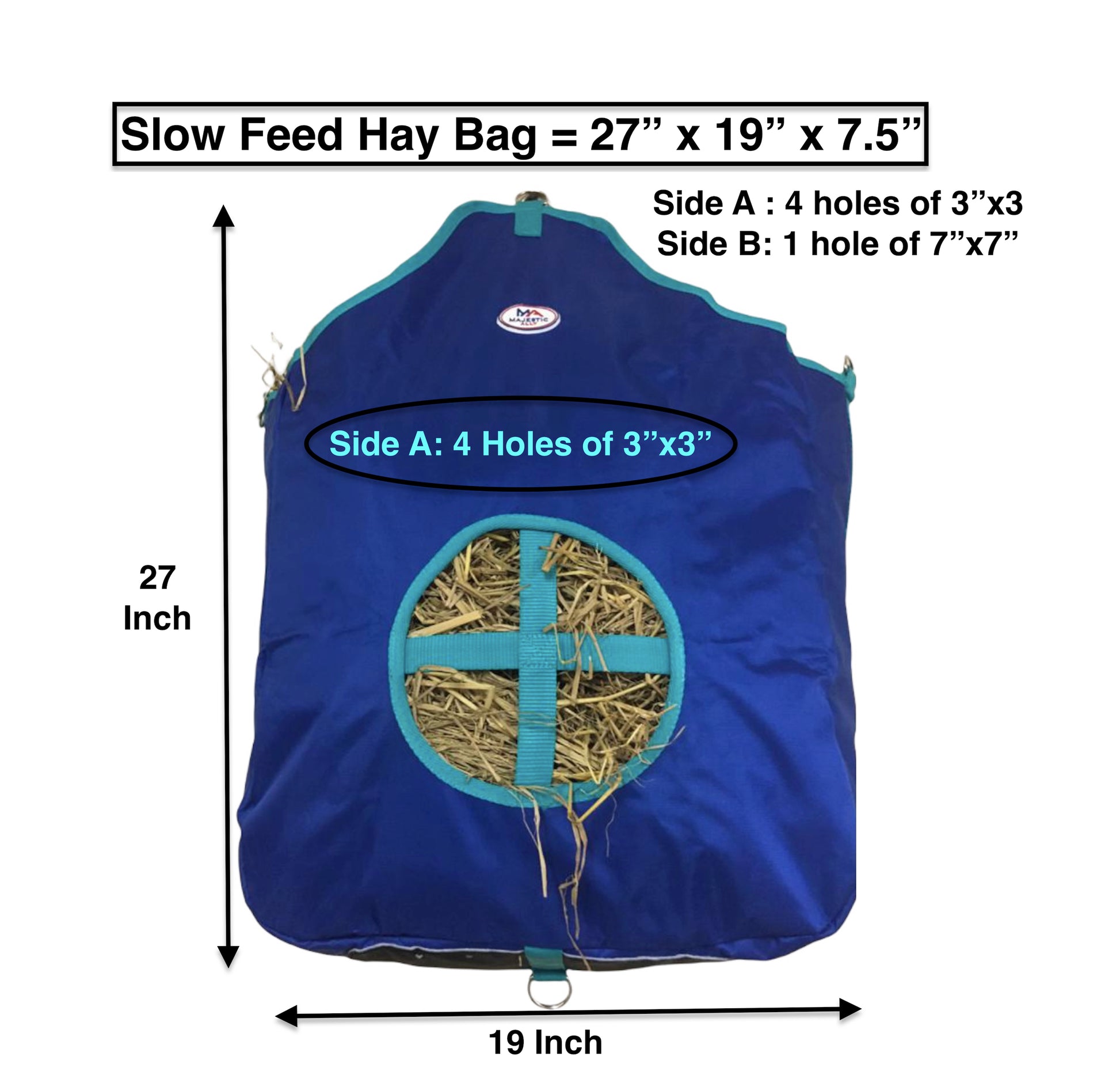 - Bag Design, Reduce Overall Food Waste – A smarter, more animal-friendly design this 27” x 19” x 7.5” hay feeder bag with 7x7" hole on one side and 3"x3" holes on other side keeps them from gulping too much food or air at the same time to reduce over-spill and hay mess, which can save you time and money.