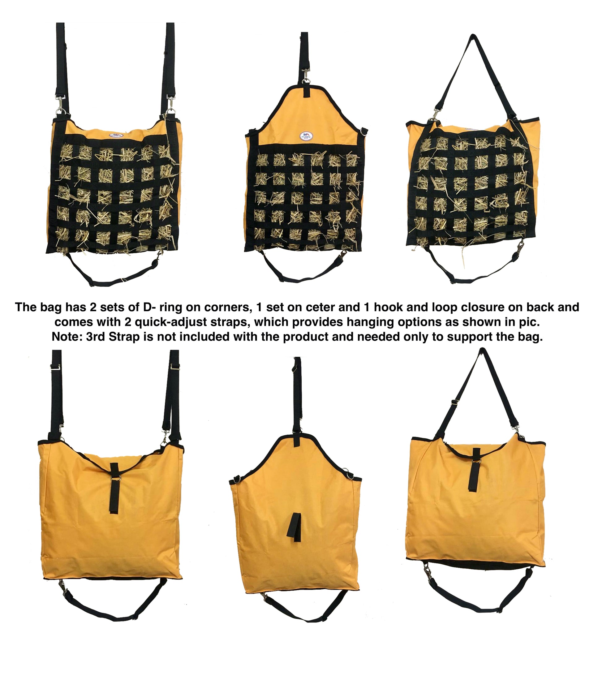 - Quick Adjustable Straps – Our bag features quick-adjust straps with D-rings to prevent top feeding and extra stabilization on the bottom to keep hay bales in place when your horse is eating; all for better accessibility.